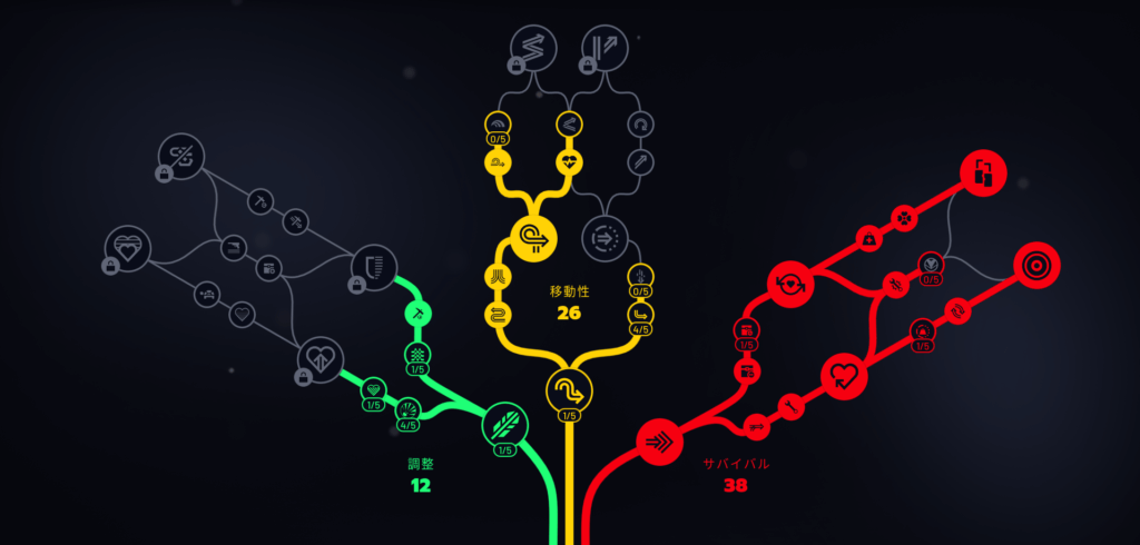 移動性とサバイバルの基礎スキルが揃ったら、調整ツリーにスキルポイントを割いていきます。