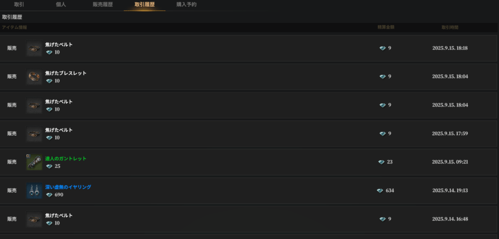 といった感じです。よくドロップする装備やアイテムでも最低価格で出せばちゃんと売れます。(10ダイヤでコツコツと出品し続けて、数千ダイヤ稼ぐこともできました)