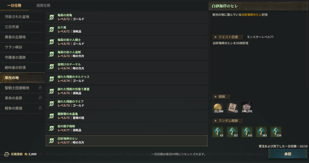 コツとしては「自分のレベルより低い一日任務を選んで効率的に敵を狩る」「任務更新をして10個全て時の欠片の報酬がもらえるクエを選択する」がおすすめです。